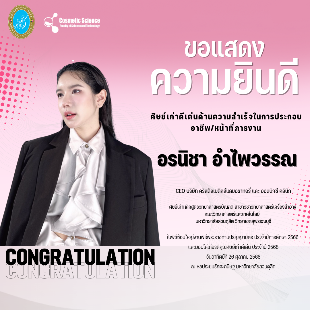 เป็นอีกหนึ่งความภาคภูมิใจของหลักสูตรวิทยาศาสตร์เครื่องสำอาง คณะวิทยาศาสตร์และเทคโนโลยี มหาวิทยาลัยสวนดุสิต วิทยาเขตสุพรรณบุรี